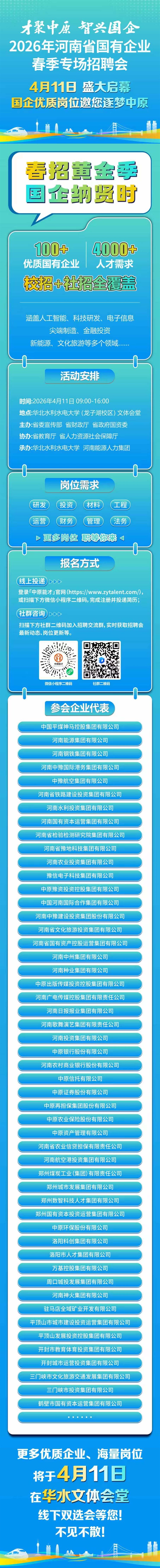 为深入实施人才强省战略,搭建国有企业与高校人才精准对接平台,助力我省国有企业高质量发展,为高校毕业生及各类优秀人才提供优质就业岗位,特举办“才聚中原 智兴国企”2026年河南省国有企业春季专场招聘会。本次招聘会由中共河南省委宣传部、河南省财政厅、河南省人民政府国有资产监督管理委员会联合主办,河南省教育厅、河南省人力资源和社会保障厅协办,华北水利水电大学、河南能源人力集团共同承办。本次招聘会分为“线上+线下”双渠道揽才,诚邀五湖四海英才齐聚中原、扎根河南,与河南国企同心同行,共绘出彩河南新篇章!